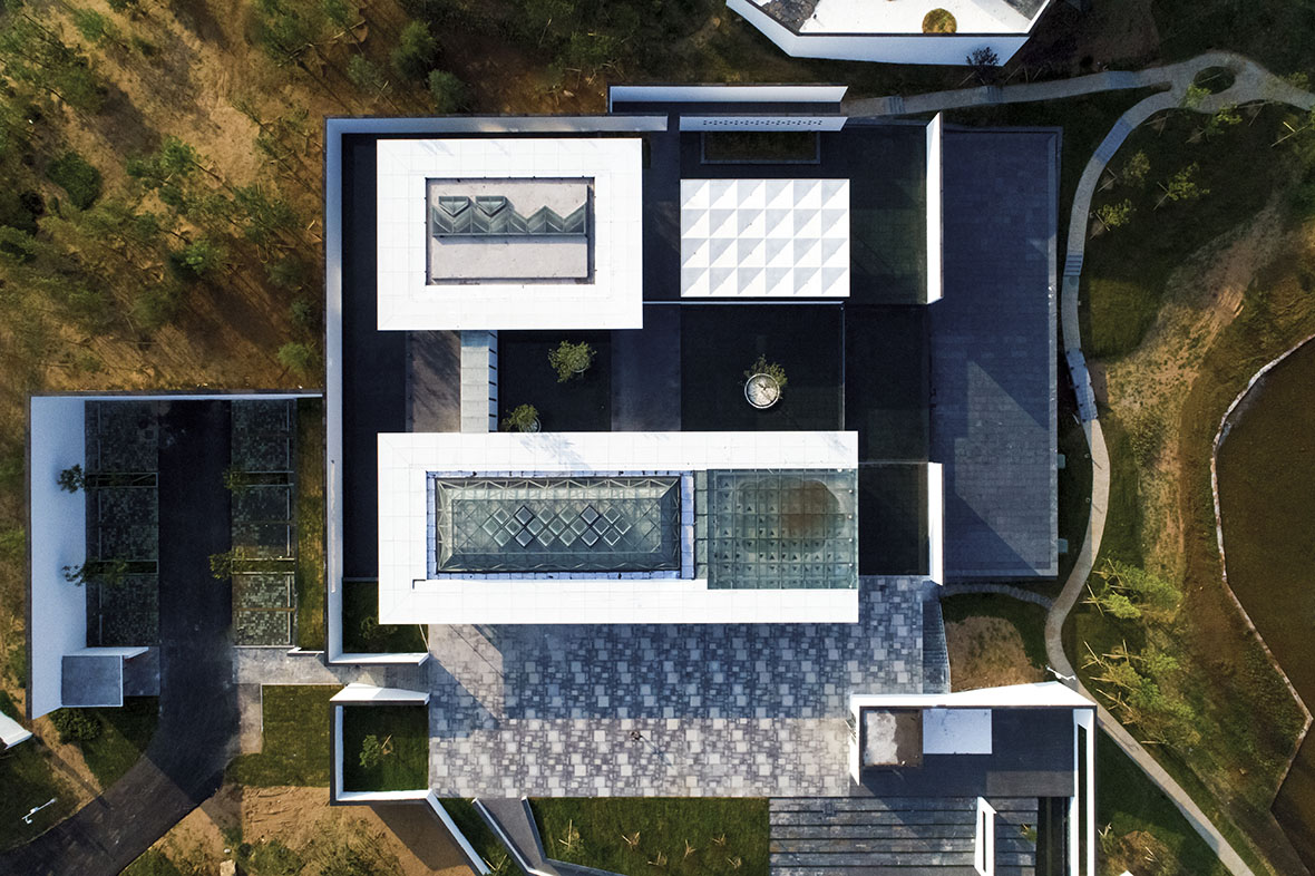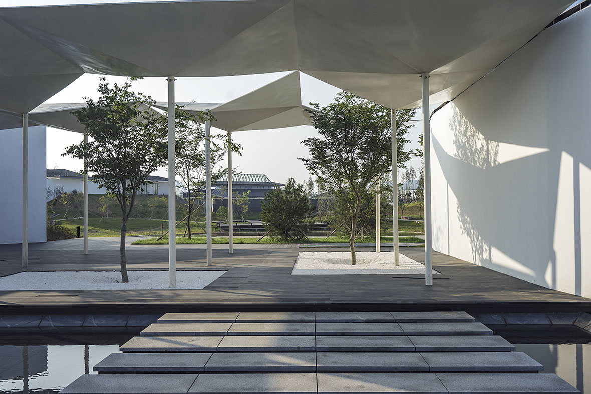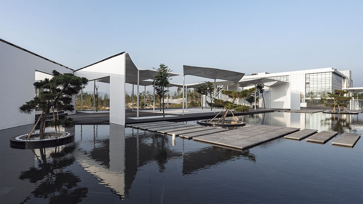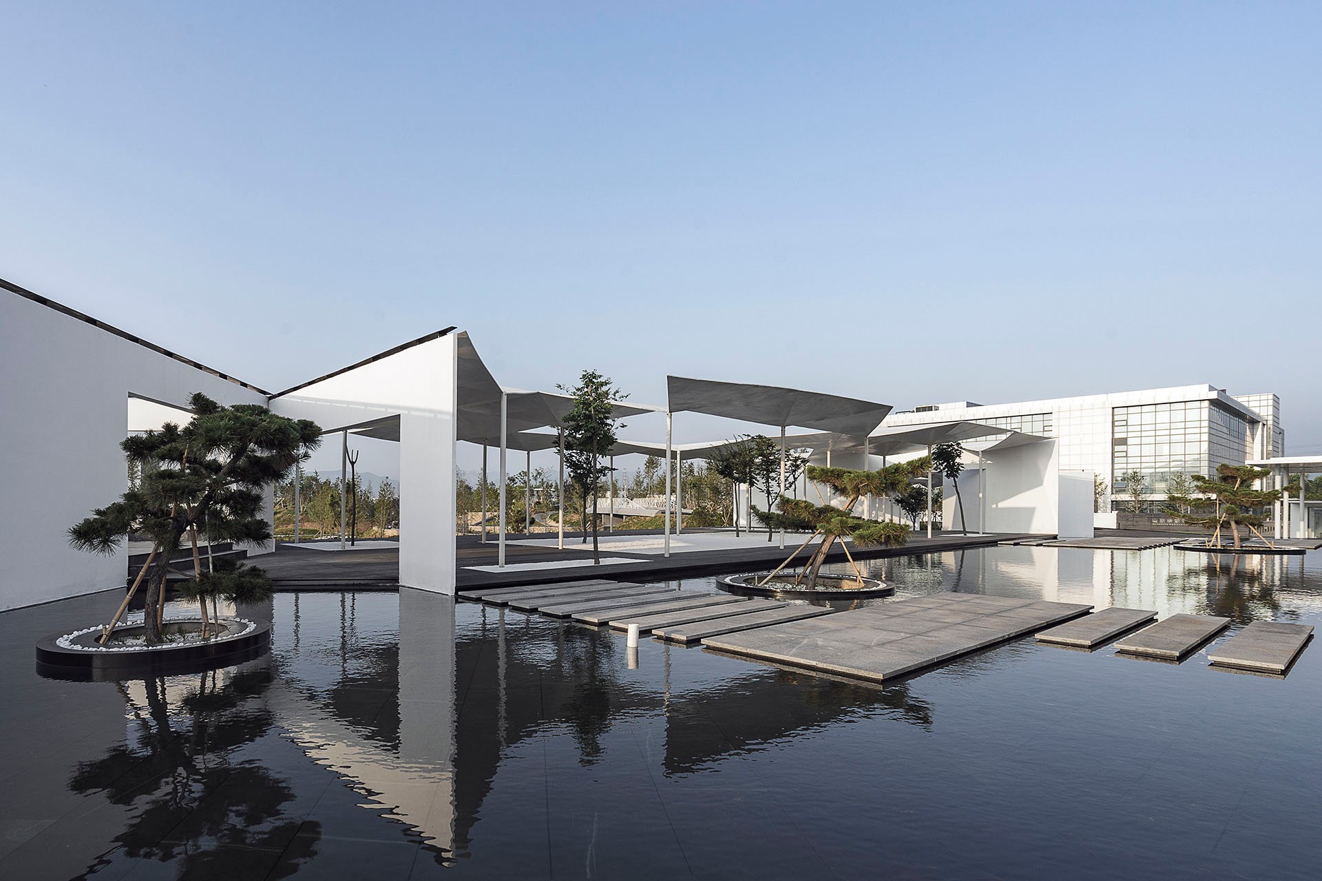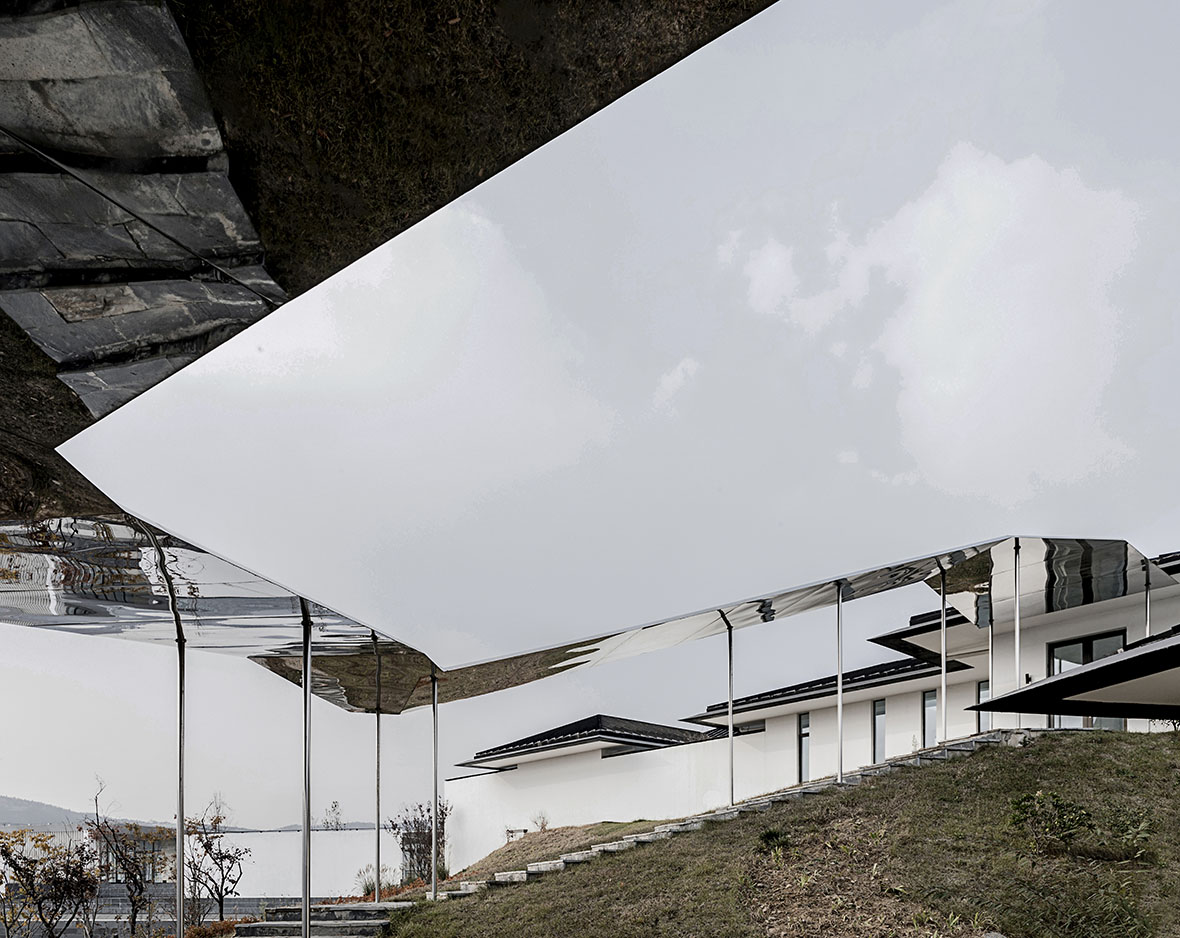 不同的廊道串联前庭建筑物,顶面镜面钢板的设计,映射周边山水环境与之融为一体;高低起伏的步道连接后院山水景观,带动观者既视感的舒心与感动。