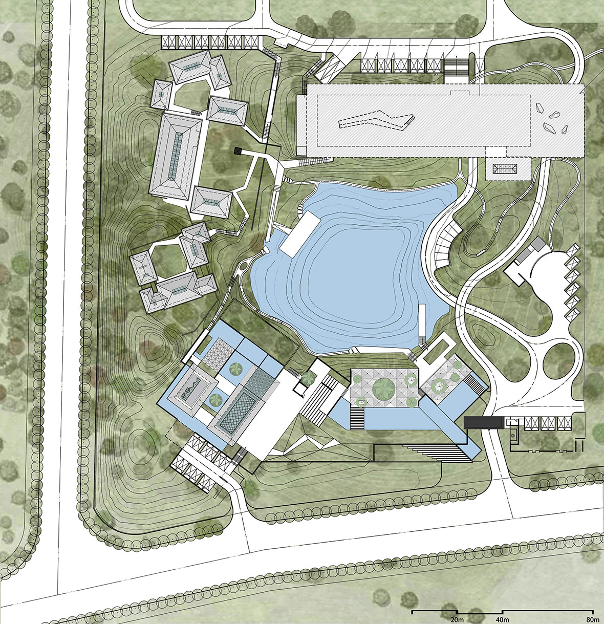 项目划分为三个区域,正面为东方写意的休闲庭院区,借由廊道链接西面的休闲功能区,汇聚咖啡厅,书吧,展厅,办公,会议等多功能一体,满足日常休闲的综合功能配套支撑服务;而东南区域为湖水休闲公园,通过山地起伏、曲折环绕,与车人分流的方式,将体验区与旁边园区、车流视线分开,使人完全融入自然之感,不被园区建筑、内部车辆所干扰。