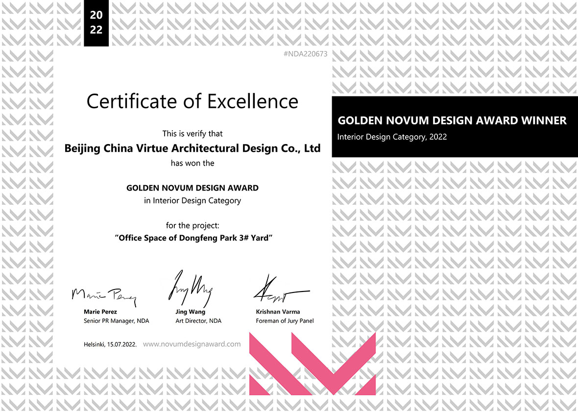 Novum Design Award(简称NDA)是国际上首屈一指的先锋设计奖,奖项面向全球范围内所有建筑、室内、城市规划与景观、家具、照明、数码艺术与平面、包装、产品、时装与纺织、摄影与照片处理相关的设计从业者开放,从作品质量、技术性、设计认证及设计分数等维度,进行严格且专业的评分标准裁定,每年在全球范围内挖掘具有创新设计理念且卓越非凡质量的设计作品,是全球高品质设计的象征。