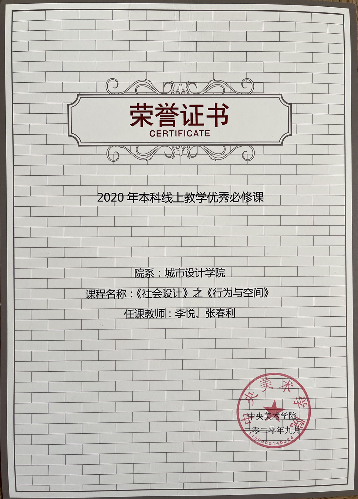 近期由于疫情影响学校授课,学生无法集中参与学校学习,借此张春利先生特别策划的《社会设计》之《行为与空间》课程,被院校授予《2020年本科线上教学优秀必修课》荣誉证书。